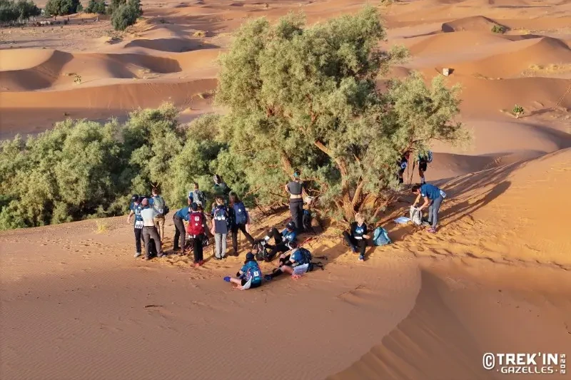 La marche du jour s’annonce chargée, entre dunes et passages rocailleux. A l’entrée du parcours, le trio 15 fait le point et profite de la vue «magnifique au lever du soleil» près de l’un des habitats les plus typiques du Maroc. Et visiblement, celui là n’est pas très avenant… «Le dromadaire nous a tiré la langue, il ne sentait pas très bon !» Concertation aussi pour les québécoises de l’équipe 20 , entraînées jusqu’ici par Karyne, journaliste spécialiste du vin, qui cherchait un défi à la hauteur pour ses 40 ans. Maxine, son amie et voisine s’est laissée convaincre, à une condition. «On joue à fond le défi CleanWalkeuse, qui consiste à ramasser les déchets que l’on trouve sur notre route. Le deuxième jour, on a rapporté 4 sacs», signale la conseillère en développement durable. L’an dernier, 36 000 litres de détritus ont été ramassés par les Gazelles.